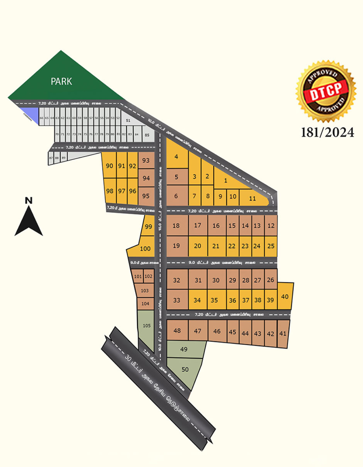 Varsha Garden is strategically located on the renowned Dindigul-Palani Highway, where rapidly rising land values make it a golden investment opportunity with excellent growth potential. Thoughtfully designed to harmonize with nature, it provides more than just a residence—it’s a perfect haven for you and your family to live happily and securely. Spanning 6.53 acres, Varsha Garden boasts excellent connectivity to leading educational institutions and city center, making it an ideal choice for both home buyers and investors. Positioned near PSNA College, it promises convenience, comfort and a bright future.
