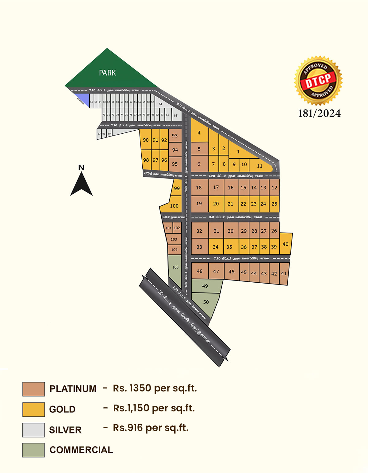 Varsha Garden is strategically located on the renowned Dindigul-Palani Highway, where rapidly rising land values make it a golden investment opportunity with excellent growth potential. Thoughtfully designed to harmonize with nature, it provides more than just a residence—it’s a perfect haven for you and your family to live happily and securely. Spanning 6.53 acres, Varsha Garden boasts excellent connectivity to leading educational institutions and city center, making it an ideal choice for both home buyers and investors. Positioned near PSNA College, it promises convenience, comfort and a bright future.
